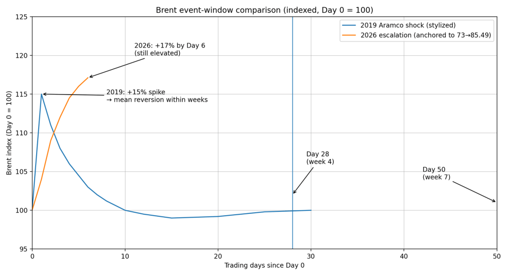 Brent crude comparison chart shows the 2026 US-Israel-Iran conflict maintaining a 17% price surge through day six, diverging from the 2019 Aramco attack’s rapid reversal pattern.